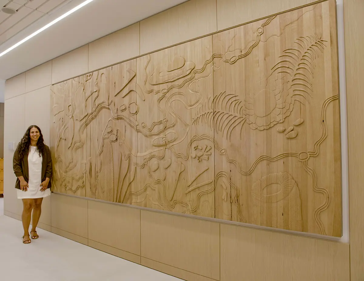Since the art exhibition at the Subiaco Museum opened, Garlett has been working on several different projects. She has worked with an Aboriginal interior designer and a team of artists at the new Ernst & Young office in Perth CBD. They have assisted in designing three levels, each focusing on different aspects of Noongar culture: country, waterway and trade. This includes artistic glazing throughout the office and a large four-metre wood carving which speaks to the story of Noongar commerce and trade.